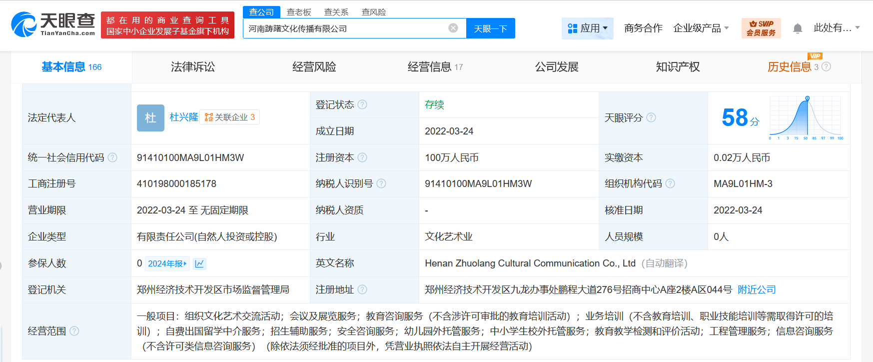帮助舞蹈机构规避监管涉事企业河南踌躇文化传播有限公司成立于2022年3月,注册资本100万人民币,实缴资本0.02万人民币,经营范围含组织文化艺术交流活动、会议及展览服务、招生辅助服务等;另一家成都承硕教育管理有限公司成立于2022年3月,注册资本100万人民币,经营范围含教育咨询服务、信息技术咨询服务、信息咨询服务、招生辅助服务、组织文化艺术交流活动、企业管理咨询等,年报信息显示,上述两公司2022年至2024年连续三年均0人参保。江西深涧文化艺术有限公司成立于2021年3月,法定代表人为周鹏翔,注册资本200万人民币,经营范围含艺术考级活动、组织文化艺术交流活动等。