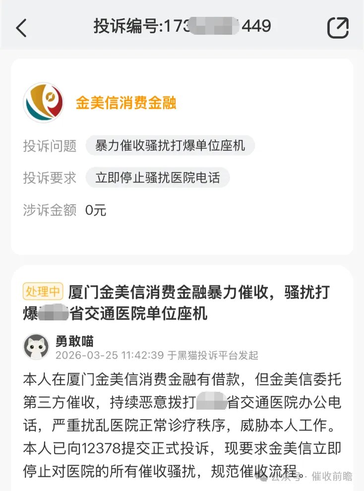 债务人未失联、可正常沟通,催收方却执意骚扰家人、恶意拨打医院电话干扰诊疗、发送威胁短信实施软暴力…… 近期,厦门金美信消费金融接连遭遇集中投诉,其委托第三方催收机构频频突破法律与道德底线。乱象背后,折射出消费金融行业监管执行缺位、外包管理失控、整改流于形式的深层问题,也让公众对持牌机构的责任担当提出强烈质疑。