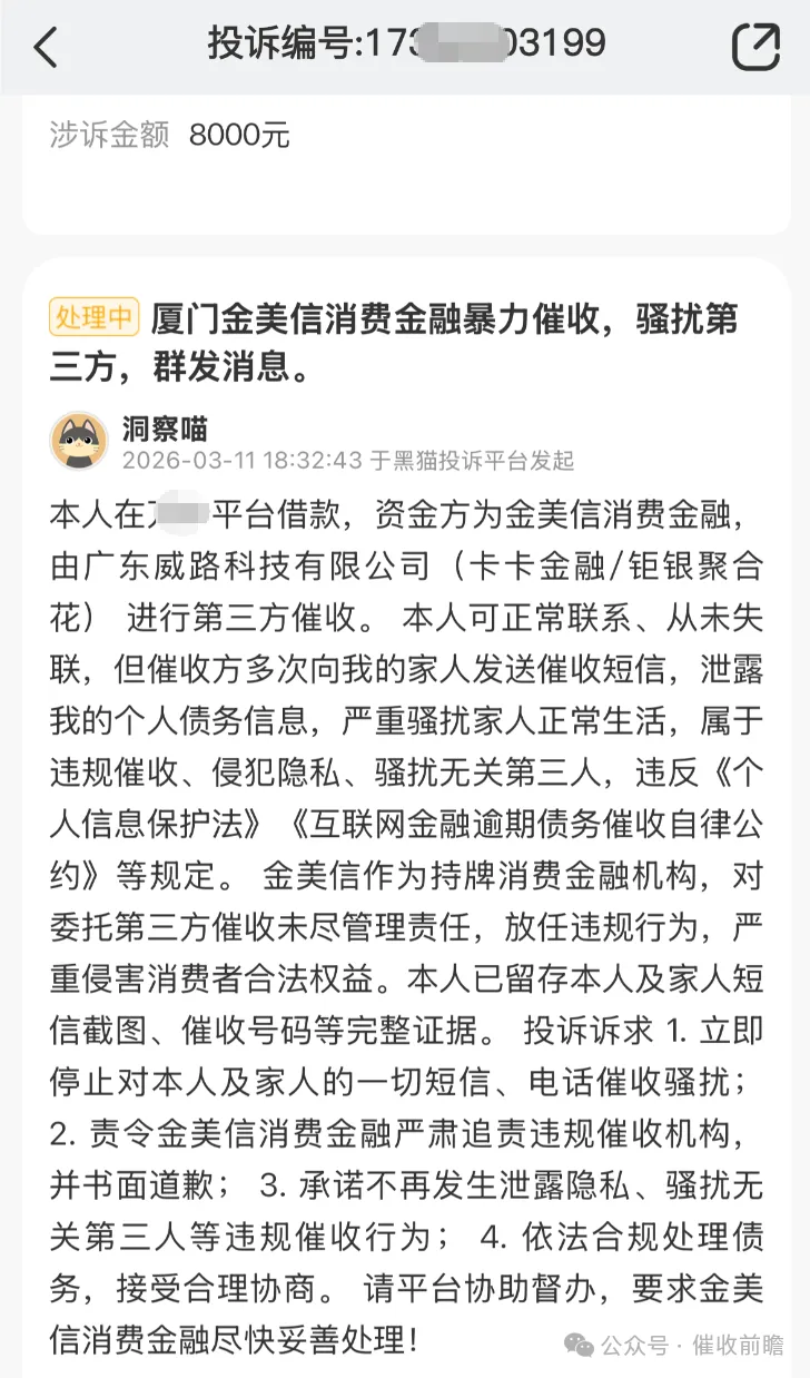 作为持牌消费金融机构,厦门金美信为多家平台提供资金服务,本应在贷后管理与催收合规上作出表率。但从多起投诉可见,其对第三方催收的管控形同虚设,放任合作机构越界作业,既侵害消费者合法权益,也破坏金融行业秩序。