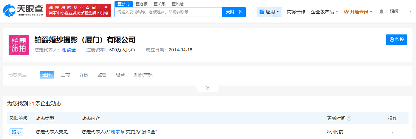 天眼风险信息显示,该公司曾多次因侵害商标权纠纷、不正当竞争纠纷、劳动争议等案由被起诉。此外,近期,铂爵旅拍旗下多家公司法定代表人及高管发生变更,包括北京铂爵婚纱摄影有限公司、大连铂爵婚纱摄影有限公司、铂爵婚纱摄影(厦门)有限公司等。