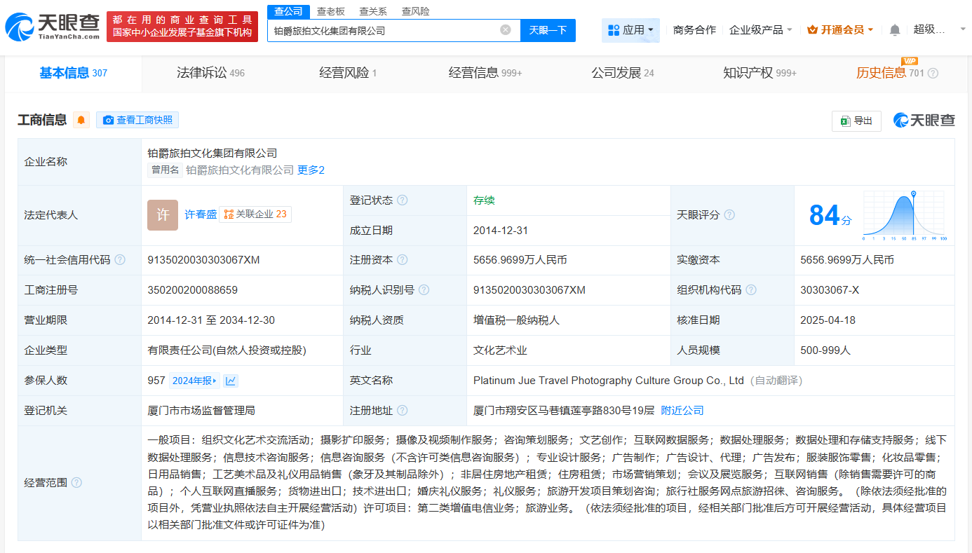 天眼查工商信息显示,铂爵旅拍文化集团有限公司成立于2014年12月,法定代表人、董事长、总经理均为许春盛,注册资本约5657万人民币,经营范围包括摄像及视频制作服务等,由许春盛、谢家章、华润国调(厦门)股权投资合伙企业(有限合伙)等共同持股。