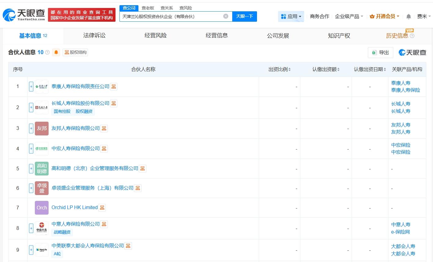天眼查App显示,近日,天津兰沁股权投资合伙企业(有限合伙)成立,执行事务合伙人为高和明德(北京)企业管理服务有限公司,出资额86.01亿人民币,经营范围为以私募基金从事股权投资、投资管理、资产管理等活动,由泰康人寿保险有限责任公司、长城人寿保险股份有限公司、友邦人寿保险有限公司、中宏人寿保险有限公司等共同出资。