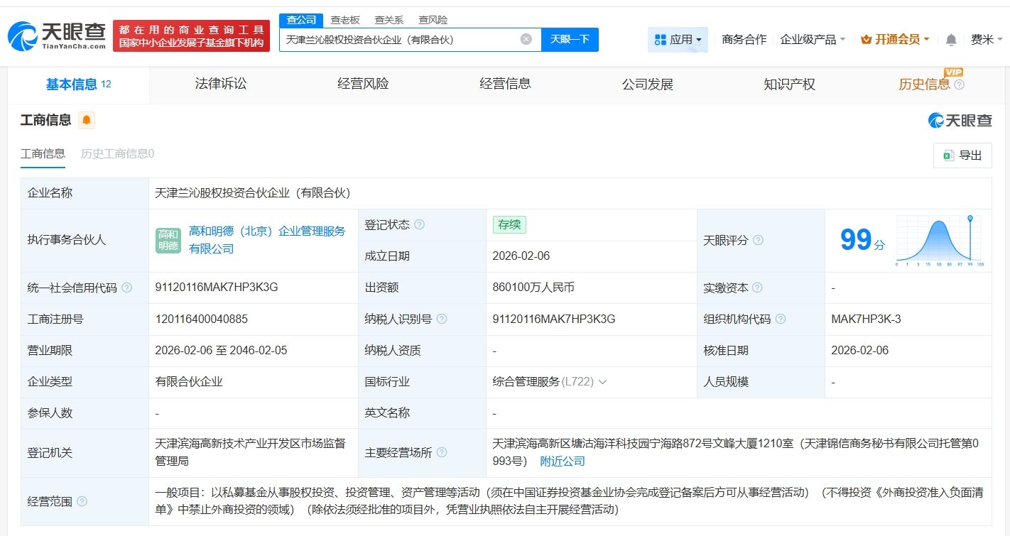 近日,天津兰沁股权投资合伙企业(有限合伙)成立,执行事务合伙人为高和明德(北京)企业管理服务有限公司,出资额86.01亿人民币,经营范围为以私募基金从事股权投资、投资管理、资产管理等活动,由泰康人寿保险有限责任公司、长城人寿保险股份有限公司、友邦人寿保险有限公司、中宏人寿保险有限公司等共同出资。