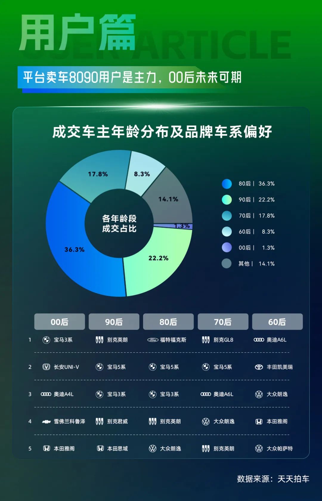 从卖车用户年龄层分布来看,80后占比最多,为36.3%;其次是90后占比22.2%;70后占比17.8%,60后占比8.3%,00后占比1.3%。不同的年龄层对品牌车系的偏好也各具特色,比如00后较多选择宝马3系、长安UNI-V、奥迪A4L、雪佛兰科鲁泽和本田雅阁;90后较多选择别克英朗、宝马5系、宝马3系、别克君威和本田思域等车;80后对于福特福克斯、宝马5系、宝马3系、别克英朗和大众朗逸有更多喜好;70后选择驾驶汽车更多倾向别克GL8、宝马5系、奥迪A6L、大众朗逸和别克英朗;60后则青睐奥迪A6L、丰田凯美瑞、大众朗逸、本田雅阁和大众帕萨特等车。
