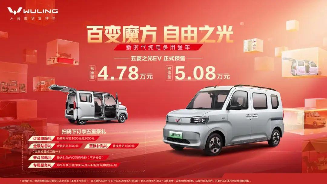 1月17日,五菱汽车宣布五菱之光EV开启预售。该车继续走五菱汽车擅长的低价路线,两个版型的预售价分别为4.78万元和5.08万元。