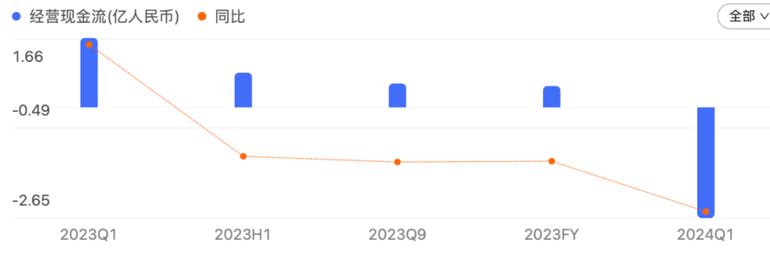 事实上,酒鬼酒当前现金流表现也不佳。2023年,酒鬼酒经营现金流净额为5123.9万元,同比下滑了87.21%;今年一季度该指标为-2.65亿元,上年同期为1.66亿元。