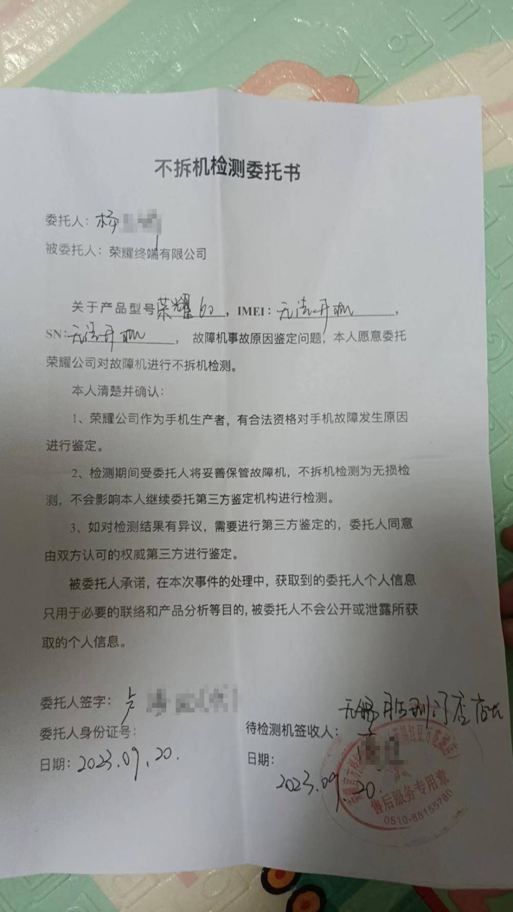 9月20日上午,手机自燃事件发生之后,杨女士便联系了荣耀客服,客服表示需要回收手机进行专业的技术检测。当日,荣耀工作人员便上门回收了自燃的荣耀60手机,并与杨女士签订了《不拆机检测委托书》。经检测,荣耀官方回应:该设备是因外力损伤电池导致的电池热失控,并非产品质量问题。