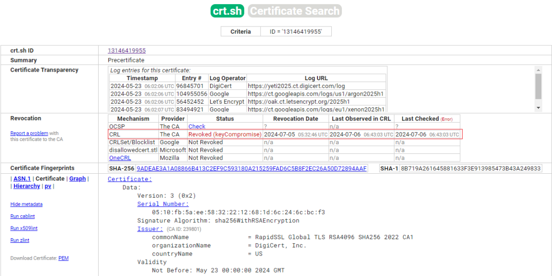 直到这名 UP 视频发出两天后,到 2024 年 7 月 5 日 05:32 (2024-07-05 05:32:46 UTC,国内时间为当日 13:32),相关证书才被绿联申请吊销,(更新说明:不一定是绿联申请吊销的,因为私钥泄露其他用户也可以联系 CA 机构提供私钥申请吊销,这属于公共安全问题,CA 确认私钥泄露后是可以撤销某些证书的)。
