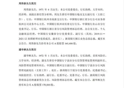 同时,林静然先生因工作调动原因辞去了副行长职务,而王超明和侯波也辞去了行长助理职务。新任副行长周伟新和潘华枫也在浙江金融界有着深厚的从业背景。