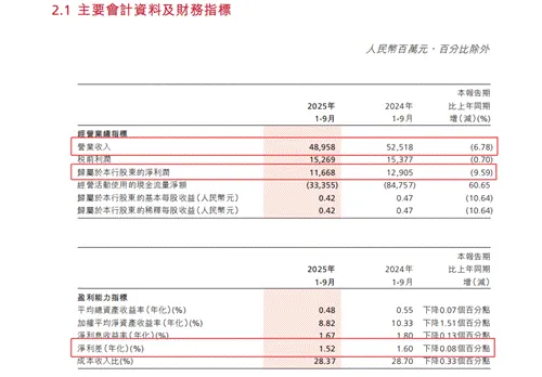 财报数据显示,2025年三季度,其营业收入489.58亿元,同比下降6.78%;归母净利润116.68亿元,同比下降9.59%。