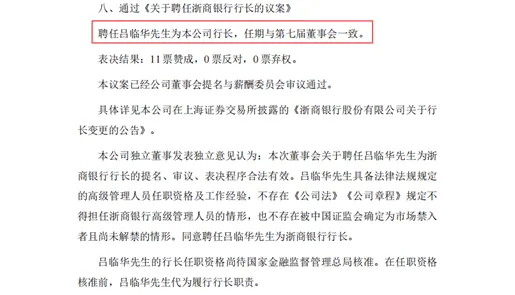 2025年12月23日,浙商银行公告称,吕临华担任浙商银行党委委员、党委副书记,并提名董事、行长人选,陈海强不再担任行长职务。12月31日,浙商银行召开第七届董事会第七次会议,审议通过了《关于聘任浙商银行行长的议案》,并任吕临华为行长。