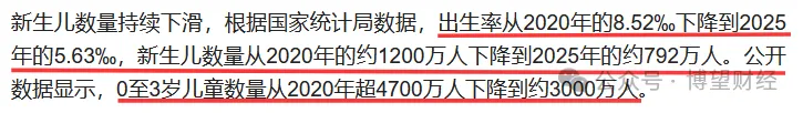 近年来,国内新生儿数量持续下滑,出生率从2020年的8.52‰降至2025年的5.63‰,新生儿数量从约1200万人锐减至约792万人,0至3岁儿童数量也从超4700万人降至约3000万人。这一趋势直接对婴幼儿奶粉市场造成了冲击。