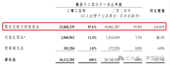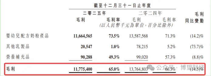 从业务板块来看,飞鹤的核心业务已亮起红灯。一直以来,飞鹤营收高度依赖婴幼儿配方奶粉。2025年该板块收入占比仍超过九成,实现收益158.68亿元,同比大幅下滑16.8%。不过,其毛利率为73.5%,较2024年提升了2.2个百分点,意味着在婴幼儿奶粉领域仍具备一定定价权,但整体收益下滑仍对营收造成较大冲击。