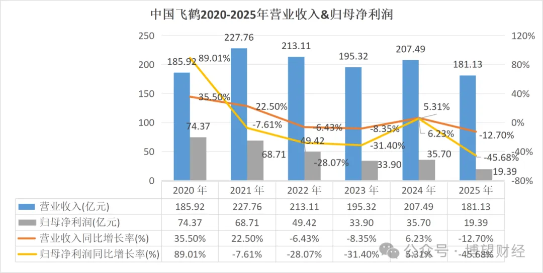 2025年,飞鹤交出的成绩单有些令人忧虑。财报显示,全年实现营业收入181.13亿元,同比下滑12.7%;归母净利润19.39亿元,同比下跌45.68%,几乎接近腰斩,整体业绩表现着实有些黯淡。