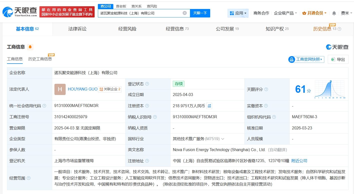 该公司成立于2025年4月,法定代表人为HOUYANG GUO,经营范围含新材料技术研发、核电设备成套及工程技术研发、发电技术服务等,现由Gaorong BNU Holding-A Limited、上海瞻日就云企业管理合伙企业(有限合伙)及上述新增股东等共同持股。公开资料显示,该公司专注于研发小型、分布式、模块化核聚变装置。