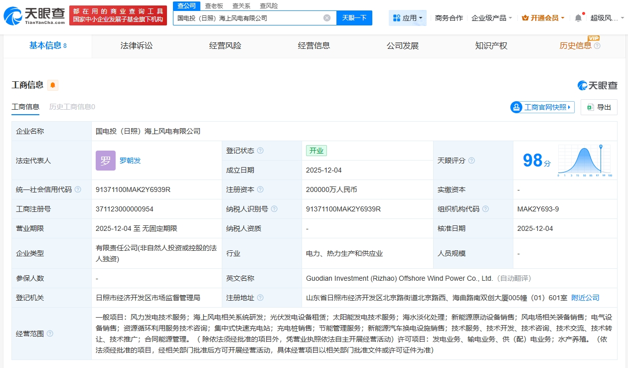天眼查App显示,近日,国电投(日照)海上风电有限公司成立,法定代表人为罗朝发,注册资本20亿人民币,经营范围包括风力发电技术服务、海上风电相关系统研发、光伏发电设备租赁、太阳能发电技术服务、新能源汽车换电设施销售等。