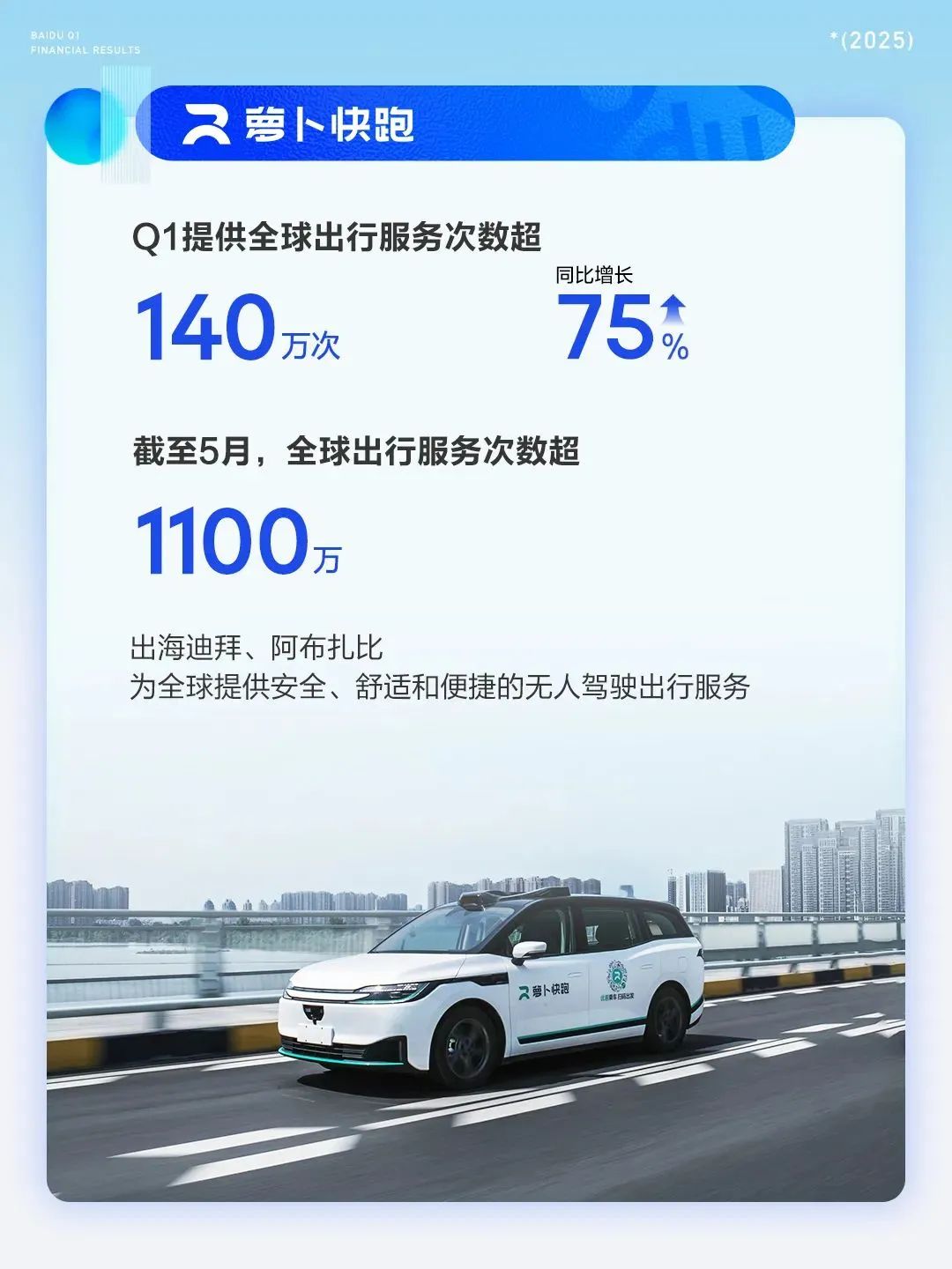 截至5月,萝卜快跑在全球累计提供超1100万次的出行服务。今年一季度,萝卜快跑在全球提供超140万次出行服务,同比增长75%。