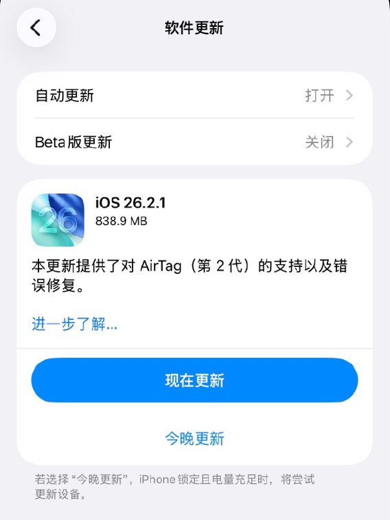 苹果发布iOS 26.2.1正式版 适配AirTag 2快讯