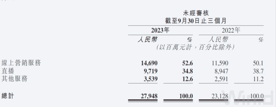 按照收入来源,快手将营收分为线上营销、直播和其他服务,三季度分别实现147亿元、97亿元和35亿元,增长27%、9%和37%,增长最慢的直播收入占总营收比减少大约4个点。其他业务营收增长最快,则是因为电商增长较快,GMV增长约三成。