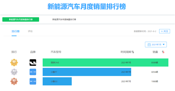 从快科技新能源汽车月度销量排行榜来看,小鹏P7在今年7月份交付6054辆,创下了P7推出以来最高的月度交付量;小鹏G3在该月份交付1986辆。