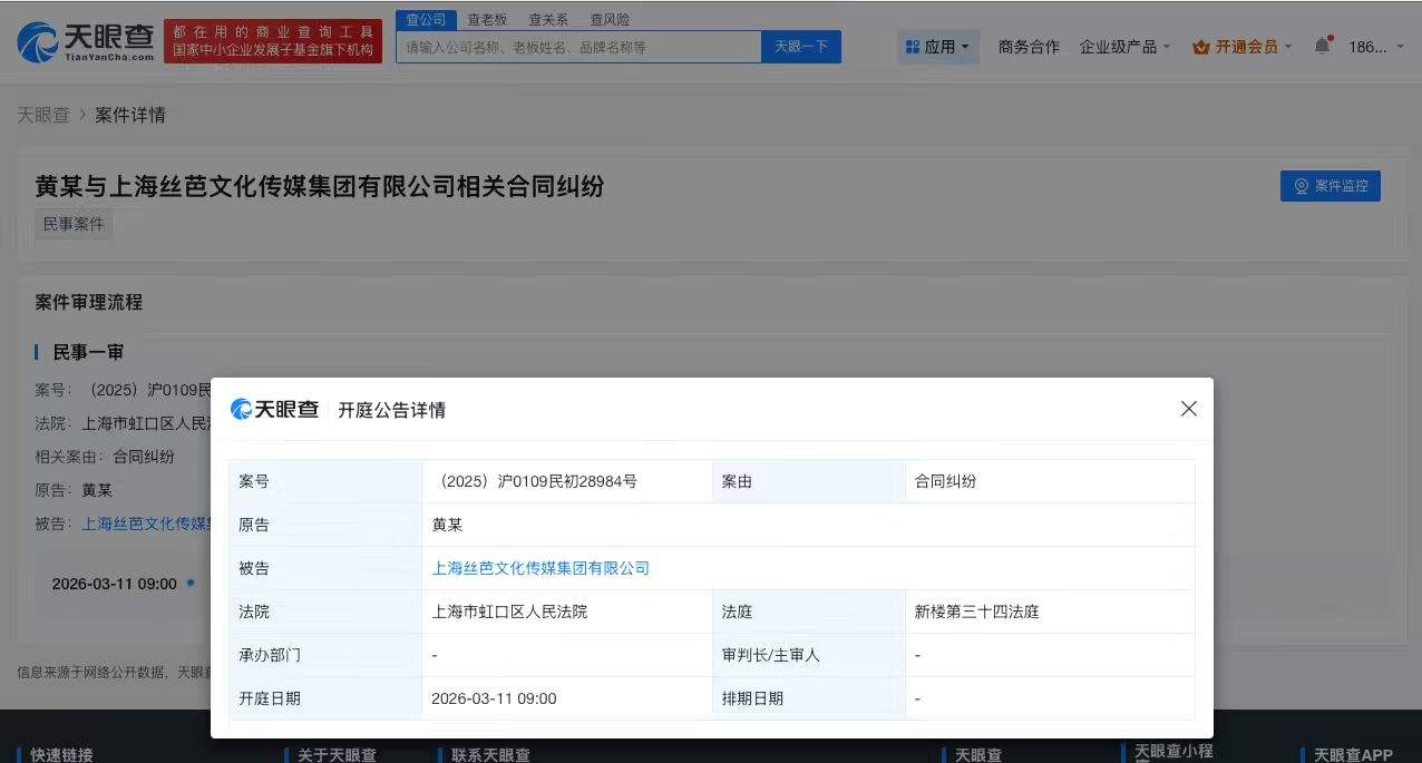 天眼查法律诉讼信息显示,近日,黄怡慈与上海丝芭文化传媒集团有限公司合同纠纷案件新增开庭公告,原告为黄怡慈,该案将于2026年3月11日在上海市虹口区人民法院开庭审理。
