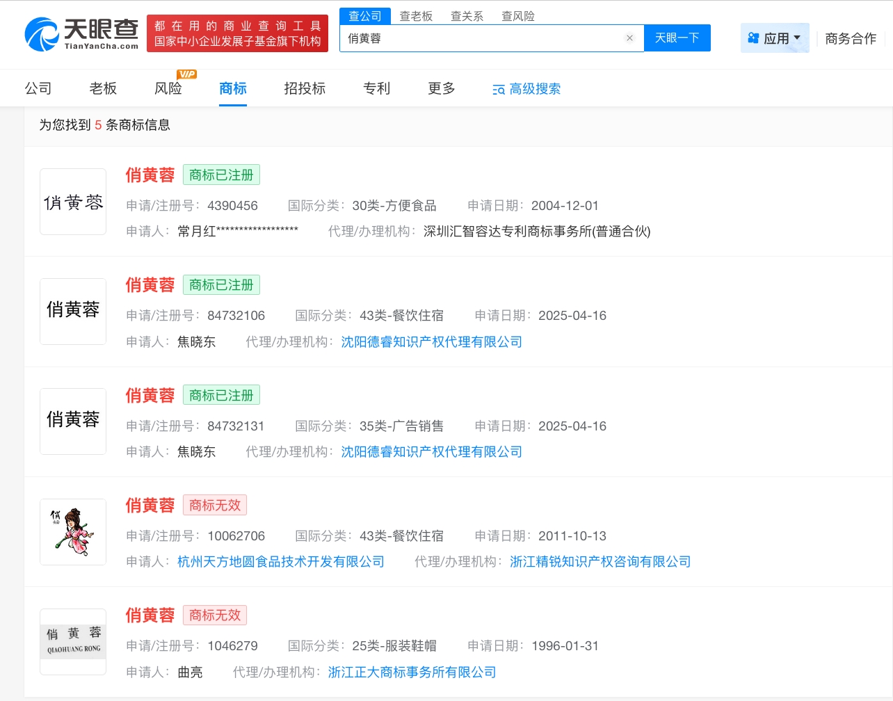 天眼查知识产权信息显示,“俏黄蓉”已被申请注册为商标,申请人包括杭州天方地圆食品技术开发有限公司及多个自然人等,国际分类包括方便食品、广告销售、餐饮住宿等,当前部分商标已成功注册。