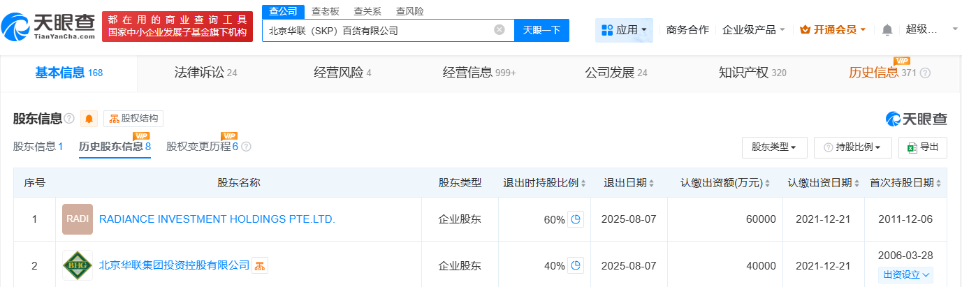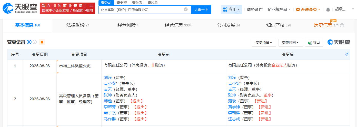 天眼查工商信息显示,近日,北京华联(SKP)百货有限公司发生工商变更,北京华联集团投资控股有限公司、RADIANCE INVESTMENT HOLDINGS PTE.LTD.退出股东行列,同时多位主要人员发生变更。