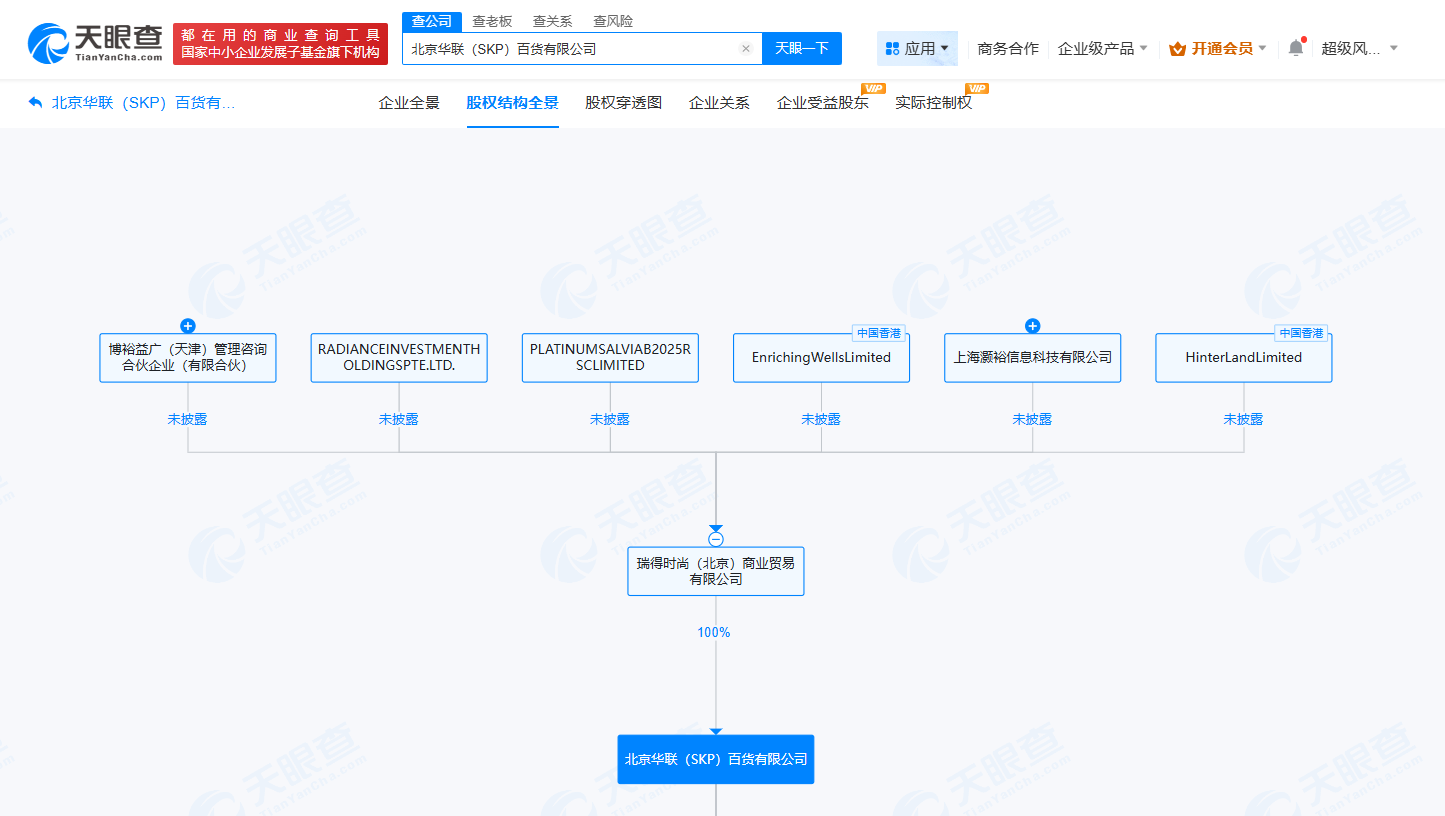 北京华联(SKP)百货有限公司成立于2006年3月,法定代表人为吉小安,注册资本10亿人民币,经营范围包括商业综合体管理服务等。股权全景穿透图显示,该公司现由瑞得时尚(北京)商业贸易有限公司全资持股,后者由博裕益广(天津)管理咨询合伙企业(有限合伙)、RADIANCE INVESTMENT HOLDINGS PTE.LTD.等共同持股。