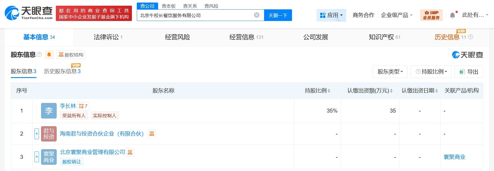 官网信息显示,牛校长为王思聪通过寰聚商管投资成立的餐饮连锁品牌。今年6月,何猷君已接手王思聪名下寰聚商管公司。