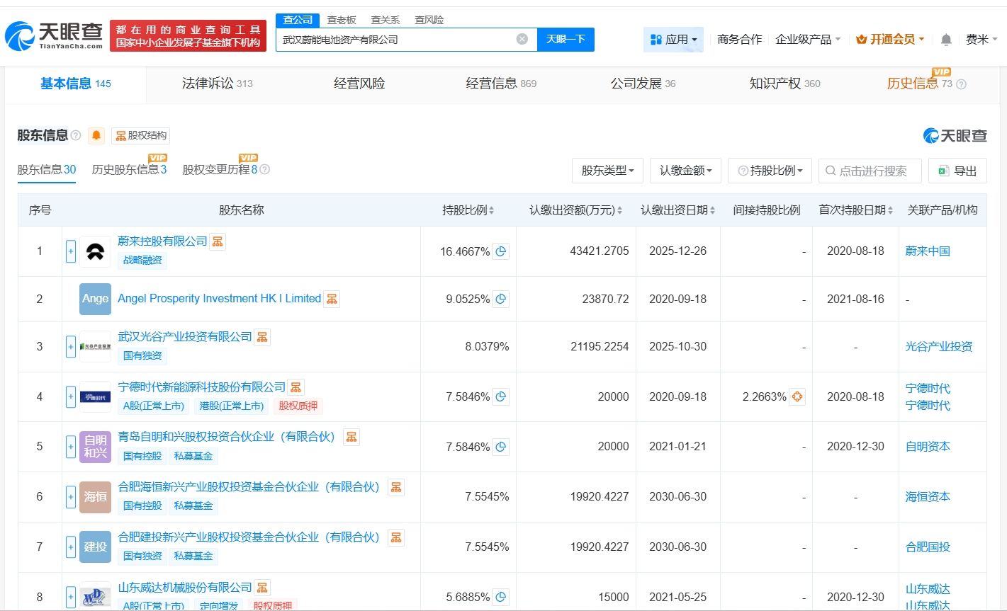 武汉蔚能电池资产有限公司成立于2020年8月,法定代表人为赖晓明,经营范围包括电动汽车充电基础设施运营、蓄电池租赁、新能源汽车废旧动力蓄电池回收及梯次利用等。股东信息显示,该公司由蔚来控股有限公司、Angel Prosperity Investment HK I Limited、武汉光谷产业投资有限公司等共同持股。