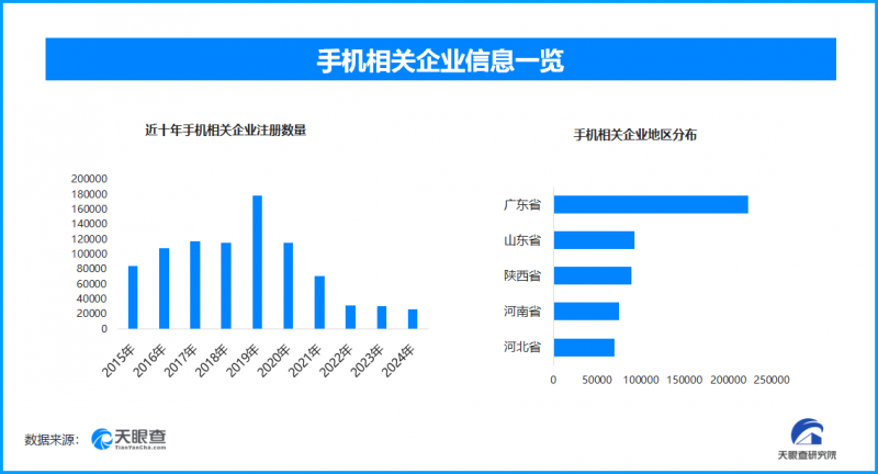 天眼查专业版数据显示,截至目前我国现存在业、存续状态的手机相关企业超125.8万家。其中,2024年新增注册相关企业约2.6万余家,从企业注册数量趋势来看,在2019年以前,手机相关企业的注册数量呈现出逐年增长的态势,并在2019年达到顶峰,为17.8万余家,此后则呈现出逐年下降态势。