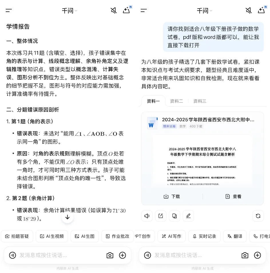 而且最重要的是千问提供数百万道真题免费使用,只需要一句话即可拥有适龄段的试题卷子,免去了家长到处找题目的烦恼,真正做到“省心又省力”。