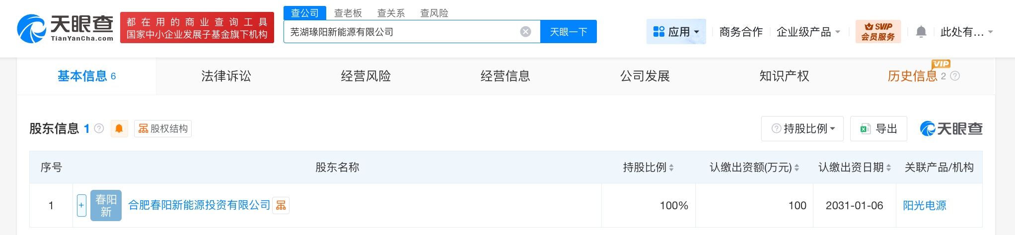 天眼查工商信息显示,近日,芜湖瑑阳新能源有限公司成立,法定代表人为姜旭,注册资本100万人民币,经营范围含太阳能发电技术服务、节能管理服务、风力发电技术服务、合同能源管理、光伏发电设备租赁、智能输配电及控制设备销售等。股东信息显示,该公司由阳光电源旗下合肥春阳新能源投资有限公司全资持股。
