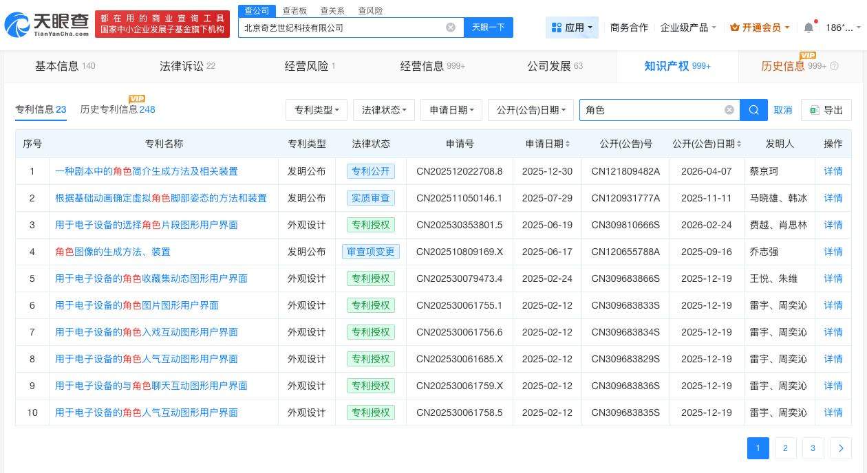天眼查知识产权信息显示,爱奇艺关联北京奇艺世纪科技有限公司已申请多个“角色”相关专利,包括“角色图像的生成方法、装置”“根据基础动画确定虚拟角色脚部姿态的方法和装置”等,当前专利法律状态多为已获授权。