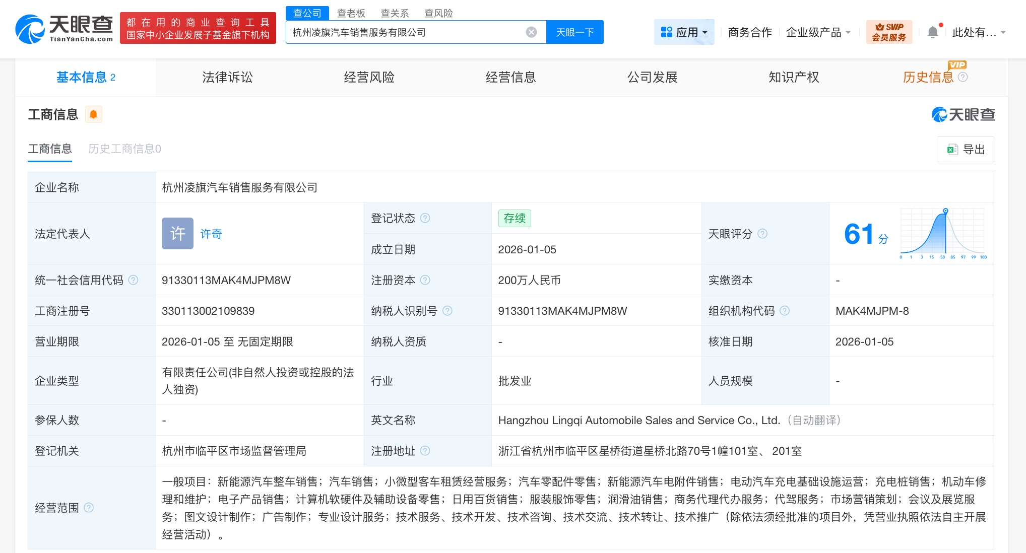 天眼查工商信息显示,近日,杭州凌旗汽车销售服务有限公司成立,法定代表人为许奇,注册资本200万人民币,经营范围含新能源汽车整车销售、汽车销售、小微型客车租赁经营服务、新能源汽车电附件销售、电动汽车充电基础设施运营、计算机软硬件及辅助设备零售等。