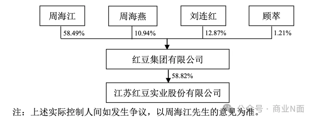 周海江与周海燕、刘连红(周海江配偶)、顾萃(周海燕配偶)一同为红豆股份的实际控制人,周海江同时是红豆集团的第一大股东、法定代表人。