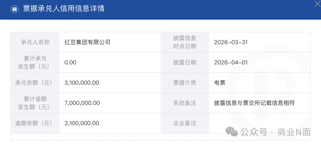 上海票据交易所4月1日披露,红豆集团票据累计逾期发生额达700万元。