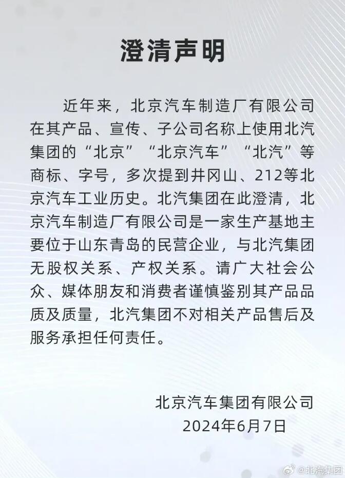 声明中提到:北京汽车制造厂有限公司是一家生产基地主要位于山东青岛的民营企业,与北汽集团无股权关系、产权关系。请广大社会公众、媒体朋友和消费者谨慎鉴别其产品品质及质量,北汽集团不对相关产品售后及服务承担任何责任。