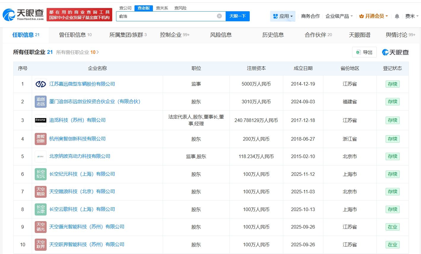 天眼查任职信息显示,俞浩名下关联20余家企业,其中10余家企业处于存续、开业或者在业状态,包括追觅科技(苏州)有限公司、自强不息(淄博)企业管理合伙企业(有限合伙)、行胜于言(厦门)企业管理合伙企业(有限合伙)等,俞浩在上述企业担任法定代表人、董事长等职务。