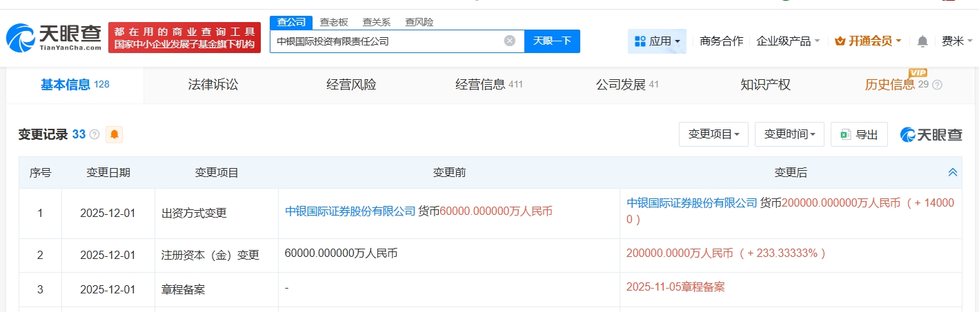 天眼查工商信息显示,近日,中银国际投资有限责任公司发生工商变更,注册资本由6亿人民币增至20亿人民币,增幅约233%。