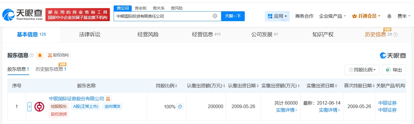 中银国际投资有限责任公司成立于2009年5月,法定代表人为于君,经营范围为投资管理、股权投资、投资咨询。股东信息显示,该公司由中银证券(601696)全资持股。