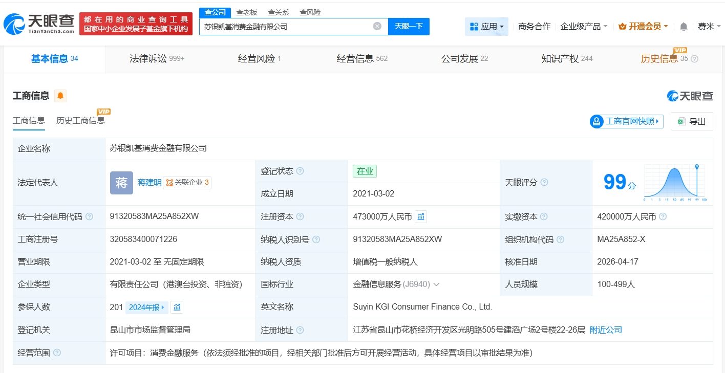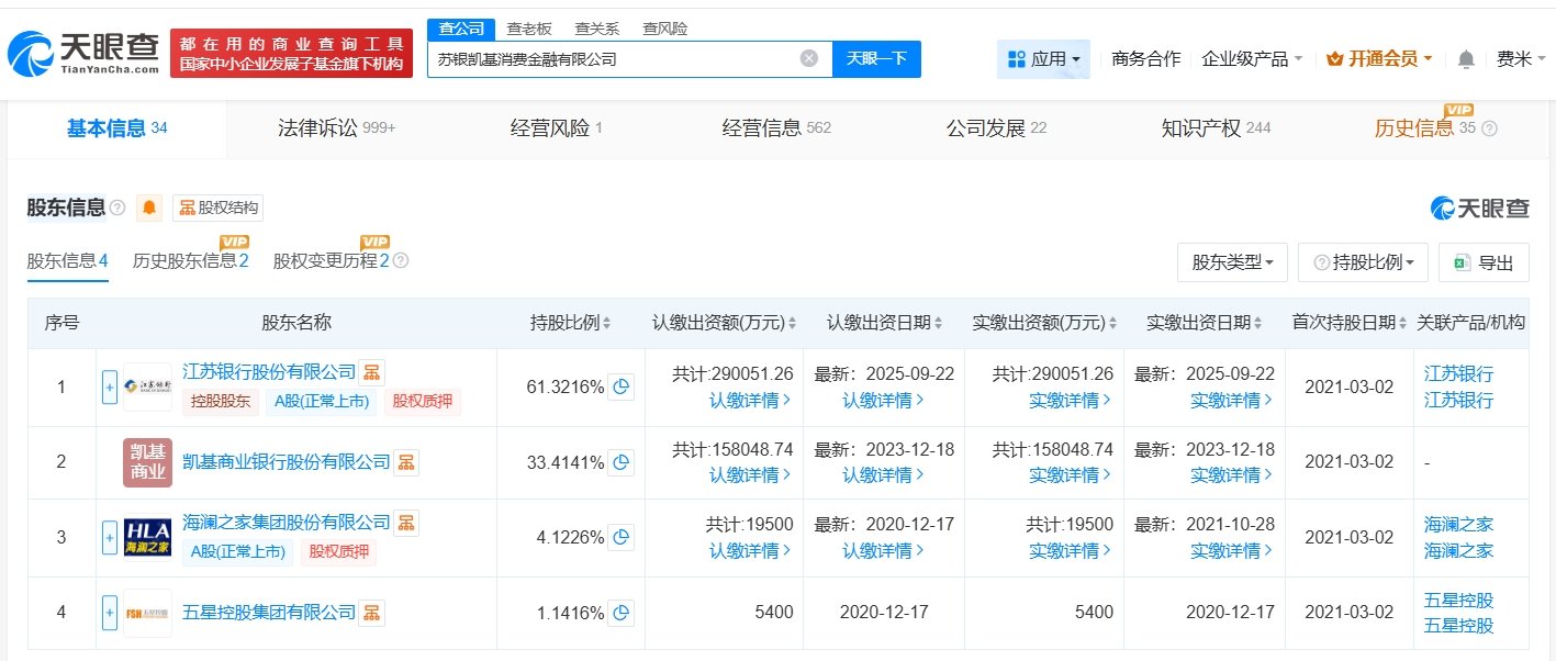 天眼查App显示,近日,苏银凯基消费金融有限公司发生工商变更,注册资本由42亿人民币增至47.3亿人民币,增幅约13%。