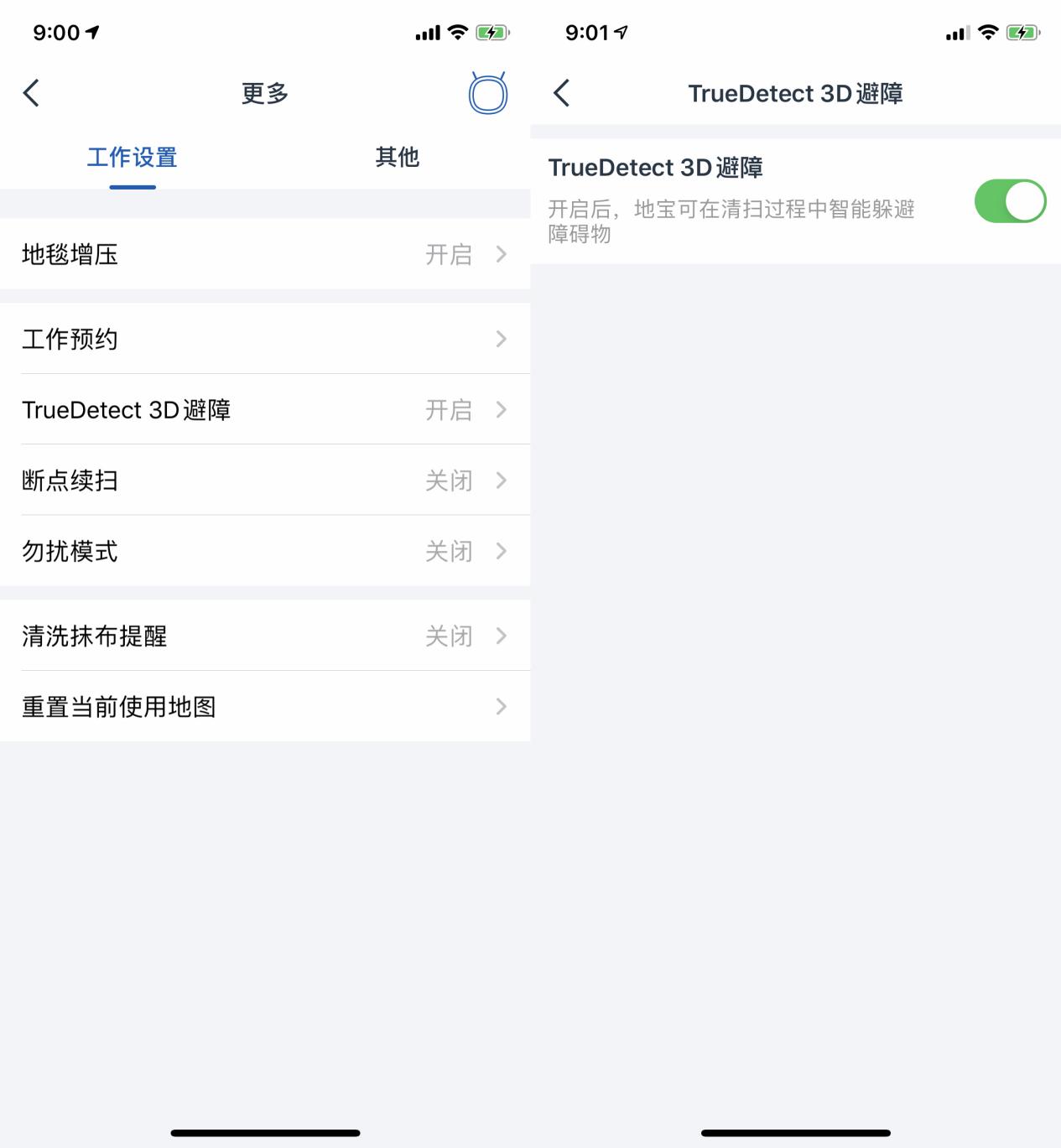 此外,科沃斯超能王还有一个独特的黑科技——地毯增压功能,在实际使用过程中,科沃斯超能王在清扫到地毯上时,可以明显听到类似涡轮增加的那种加大吸力的声音,可以实现更有力的清扫,这也是云鲸所不具备的。