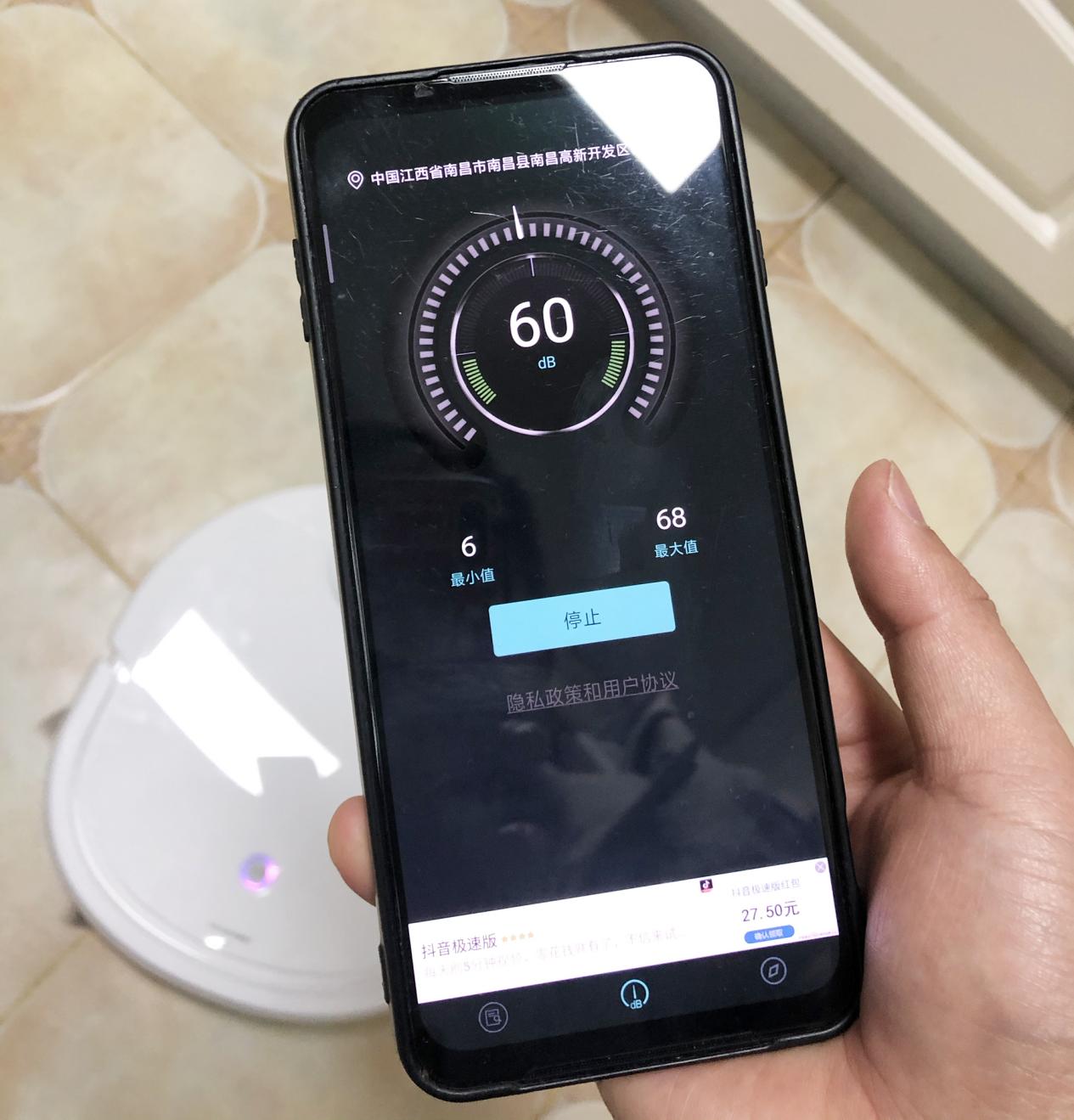 云鲸扫地机机器人日常噪音最高为68分贝,基本在60分贝左右波动。