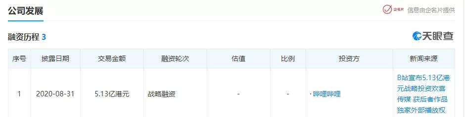 根据天眼查APP数据显示,B站以5.13亿港元战略投资欢喜传媒集团有限公司,交易完成之后,B站将获得欢喜传媒9.9%的股份,同时也将获得欢喜传媒集团独家外部播放权。