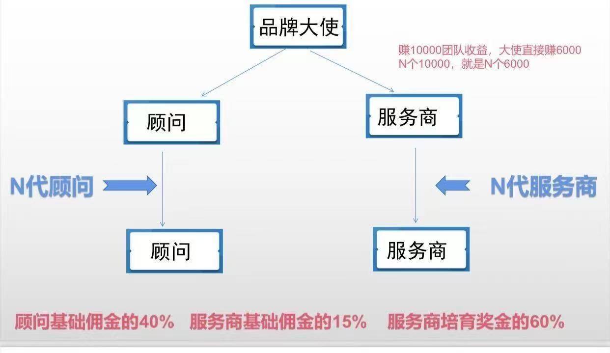 当服务商达成“滚动90天内培育奖金3500元、个人销售收益6000元”,完成审核后可晋升为大使。大使卖货佣金比顾问提升40%,可以提伞下所有顾问销售佣金的40%、伞下所有服务商基础销售佣金的15%,伞下所有服务商团队收益的60%,以及直属大使销售佣金的10%和直属大使团队收益的30%。