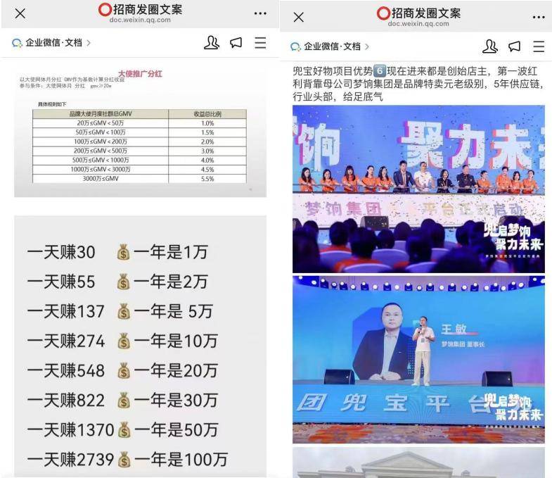 其四,虽然删除了两大课程,但在最新“团队百宝箱”——“招商发圈文案”下,仍然存在“兜宝母公司梦饷集团”等表述,以及部分佣金体系介绍。