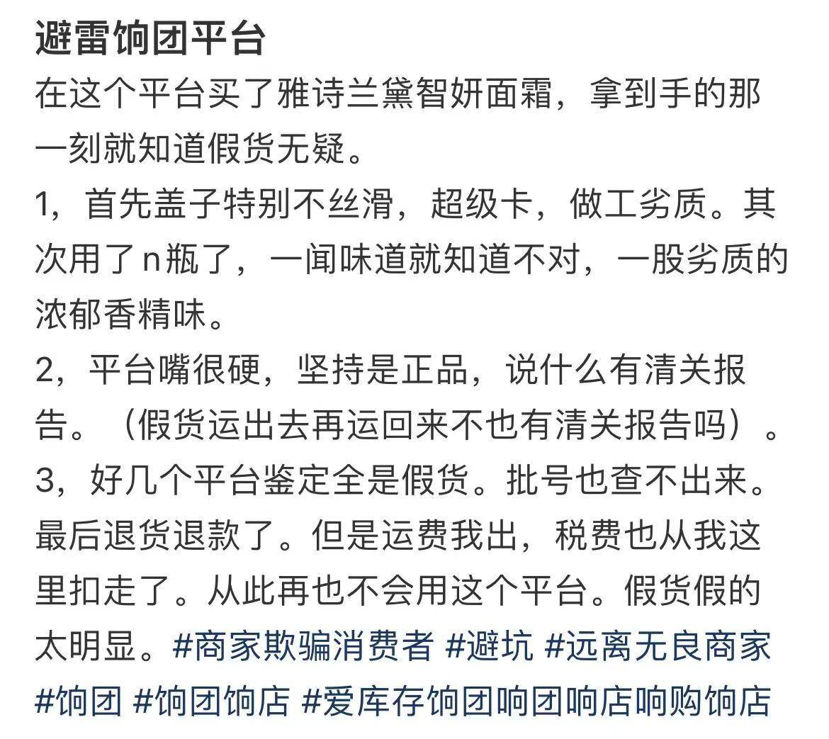 “饷店”自创办以来,便以“大牌低价”作为其核心卖点,吸引了大量消费者的目光。平台上,众多国际知名品牌以远低于市场价的价格销售,让人不禁心动。然而,低价背后往往隐藏着不为人知的秘密。据南方都市报报道,今年3月1日,在小红书,有用户表示,在饷团购买雅诗兰黛智妍面霜,到手后发现做工劣质、味道不对,在第三方平台检测后,显示“不符合正品工艺”。反馈后,商家称可以通过掌上海关查询商品真伪,如依旧不放心,可以申请退货。该用户认为,假货可以先运出去再清关回售,并不能确认真伪,因此选择退货,但自己承担了运费及税费。