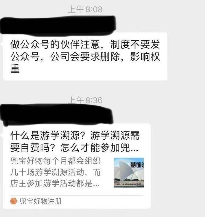 其一,《情况说明》发出后不久,即有“导师”在兜宝好物学习群里要求做公众号的伙伴不要将奖励制度发公众号,公司会要求删除。