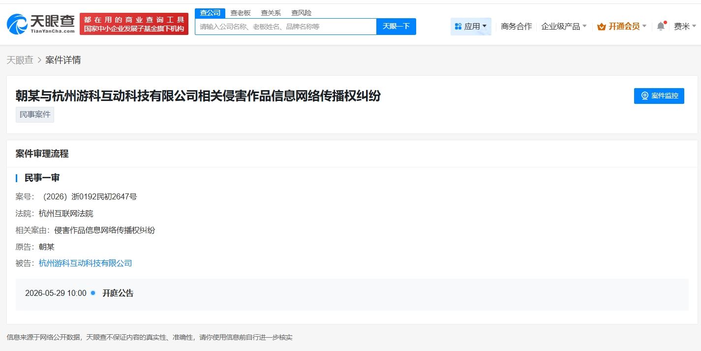 天眼查App显示,近日,黑神话悟空出品方杭州游科互动科技有限公司新增一则开庭公告,案由为侵害作品信息网络传播权纠纷,原告为朝某,该案将于5月29日在杭州互联网法院开庭审理。